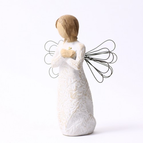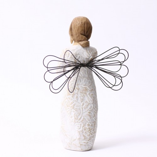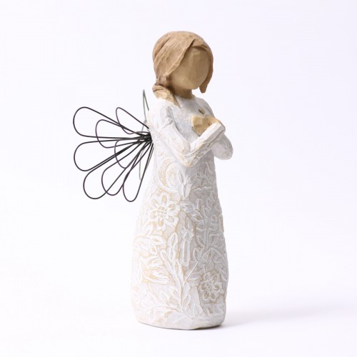 そして実際に手にした感じ。これもクセになってしまうポイントでして、意外とずっしりと重く高品質感があり、表面をなでると彫刻の面が感じられて、なんだかすべすべしていて、ああ彫刻っていいなと、そんな風に感じて頂けるんじゃないかと思います。ウィローツリーのデザインコンセプトは「アンティーク」で、敢えて色褪せたようにペイントされ、天使の羽根には錆び加工がされています。1つ1つペイントされているので、時期によって少しづつ色合いが異なりますので、そういったところも楽しんで頂ければと思っています。