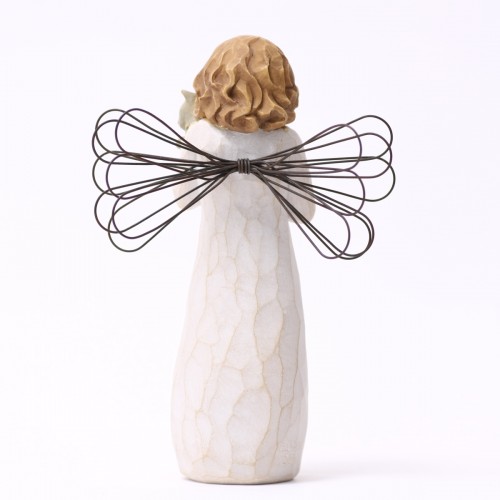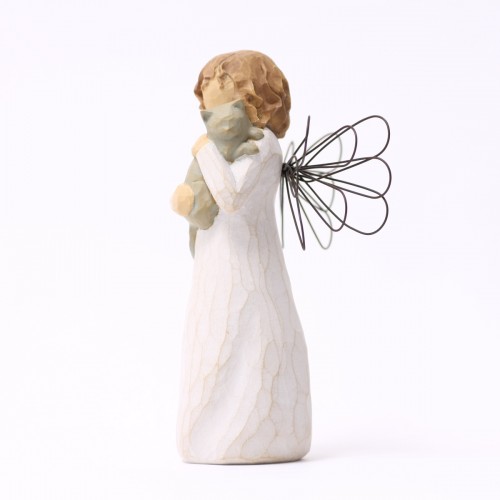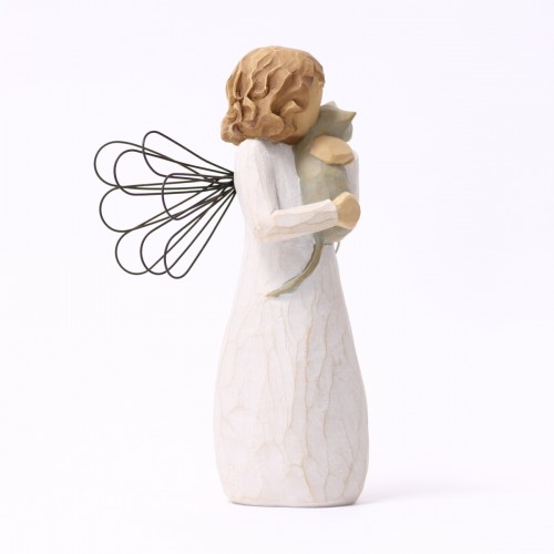 そして実際に手にした感じ。これもクセになってしまうポイントでして、意外とずっしりと重く高品質感があり、表面をなでると彫刻の面が感じられて、なんだかすべすべしていて、ああ彫刻っていいなと、そんな風に感じて頂けるんじゃないかと思います。ウィローツリーのデザインコンセプトは「アンティーク」で、敢えて色褪せたようにペイントされ、天使の羽根には錆び加工がされています。1つ1つペイントされているので、時期によって少しづつ色合いが異なりますので、そういったところも楽しんで頂ければと思っています。
