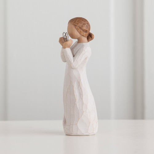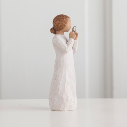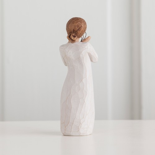 そして実際に手にした感じ。これもクセになってしまうポイントでして、意外とずっしりと重く高品質感があり、表面をなでると彫刻の面が感じられて、なんだかすべすべしていて、ああ彫刻っていいなと、そんな風に感じて頂けるんじゃないかと思います。ウィローツリーのデザインコンセプトは「アンティーク」で、敢えて色褪せたようにペイントされ、天使の羽根には錆び加工がされています。1つ1つペイントされているので、時期によって少しづつ色合いが異なりますので、そういったところも楽しんで頂ければと思っています。