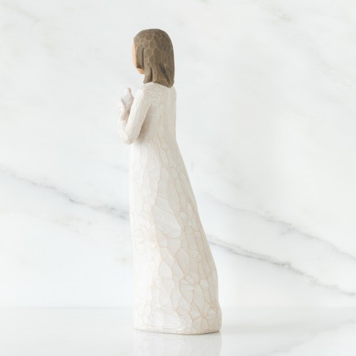 そして実際に手にした感じ。これもクセになってしまうポイントでして、意外とずっしりと重く高品質感があり、表面をなでると彫刻の面が感じられて、なんだかすべすべしていて、ああ彫刻っていいなと、そんな風に感じて頂けるんじゃないかと思います。ウィローツリーのデザインコンセプトは「アンティーク」で、敢えて色褪せたようにペイントされ、天使の羽根には錆び加工がされています。1つ1つペイントされているので、時期によって少しづつ色合いが異なりますので、そういったところも楽しんで頂ければと思っています。