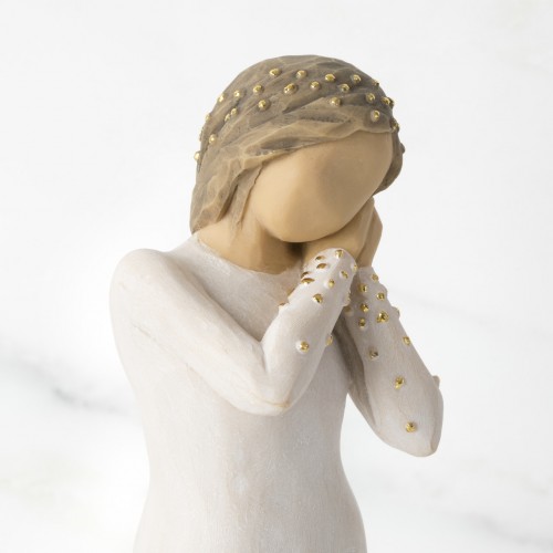そして実際に手にした感じ。これもクセになってしまうポイントでして、意外とずっしりと重く高品質感があり、表面をなでると彫刻の面が感じられて、なんだかすべすべしていて、ああ彫刻っていいなと、そんな風に感じて頂けるんじゃないかと思います。ウィローツリーのデザインコンセプトは「アンティーク」で、敢えて色褪せたようにペイントされ、天使の羽根には錆び加工がされています。1つ1つペイントされているので、時期によって少しづつ色合いが異なりますので、そういったところも楽しんで頂ければと思っています。