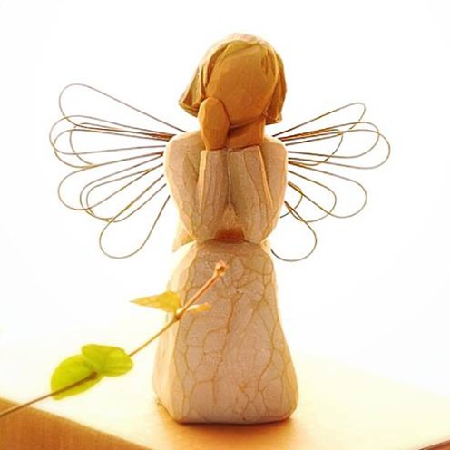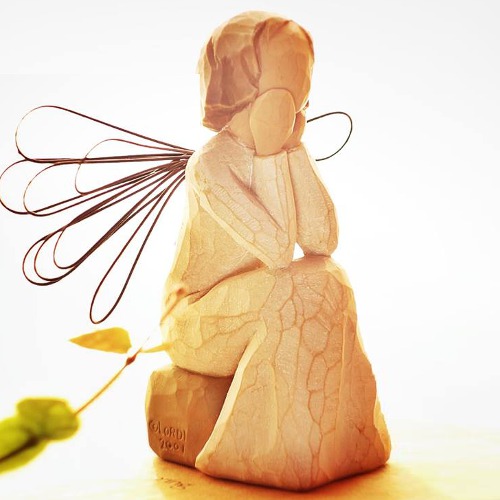 そして実際に手にした感じ。これもクセになってしまうポイントでして、意外とずっしりと重く高品質感があり、表面をなでると彫刻の面が感じられて、なんだかすべすべしていて、ああ彫刻っていいなと、そんな風に感じて頂けるんじゃないかと思います。ウィローツリーのデザインコンセプトは「アンティーク」で、敢えて色褪せたようにペイントされ、天使の羽根には錆び加工がされています。1つ1つペイントされているので、時期によって少しづつ色合いが異なりますので、そういったところも楽しんで頂ければと思っています。