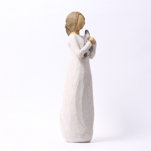 そして実際に手にした感じ。これもクセになってしまうポイントでして、意外とずっしりと重く高品質感があり、表面をなでると彫刻の面が感じられて、なんだかすべすべしていて、ああ彫刻っていいなと、そんな風に感じて頂けるんじゃないかと思います。ウィローツリーのデザインコンセプトは「アンティーク」で、敢えて色褪せたようにペイントされ、天使の羽根には錆び加工がされています。1つ1つペイントされているので、時期によって少しづつ色合いが異なりますので、そういったところも楽しんで頂ければと思っています。