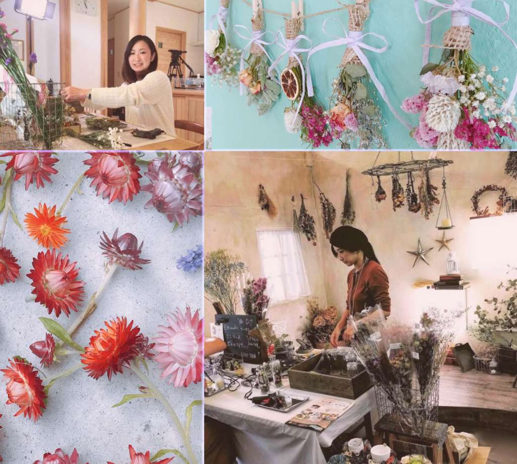 ドライフラワーの魅力は何といっても自然そのままの色合い。中でも色味がナチュラルかつ鮮やかで、長持ちする花弁のしっかりしたお花を中心に選んでいます。柔らかい花びらの花材は、染色したプリザーブドフラワーを使っています。土台に使っているのはファイバー(植物繊維)やモス(苔)で、ぜんぶ本物の自然素材です。