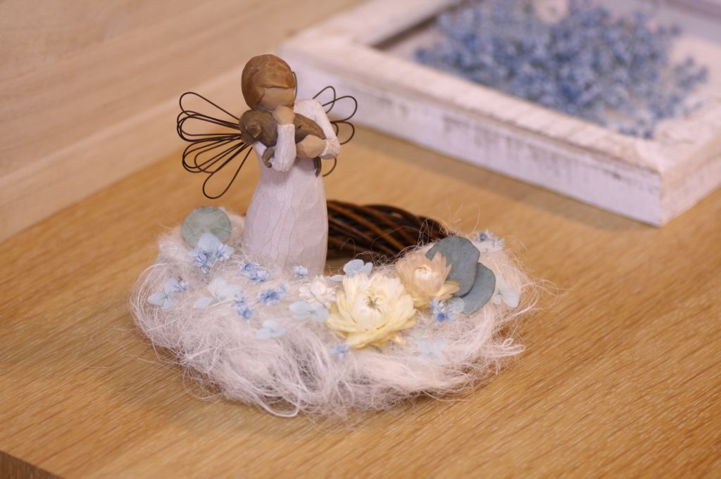 そして実際に手にした感じ。これもクセになってしまうポイントでして、意外とずっしりと重く高品質感があり、表面をなでると彫刻の面が感じられて、なんだかすべすべしていて、ああ彫刻っていいなと、そんな風に感じて頂けるんじゃないかと思います。ウィローツリーのデザインコンセプトは「アンティーク」で、敢えて色褪せたようにペイントされ、天使の羽根には錆び加工がされています。1つ1つペイントされているので、時期によって少しづつ色合いが異なりますので、そういったところも楽しんで頂ければと思っています。