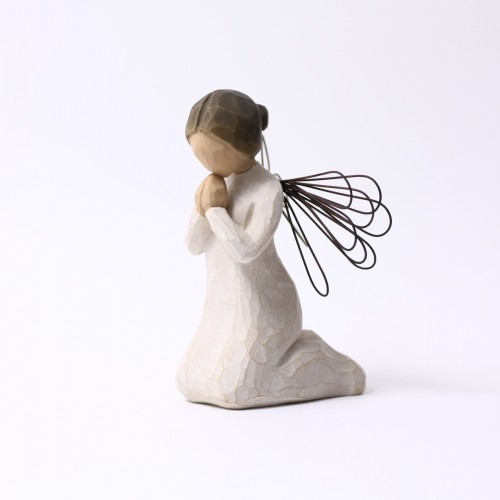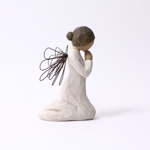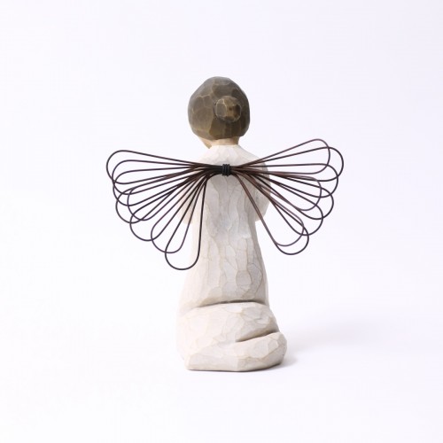そして実際に手にした感じ。これもクセになってしまうポイントでして、意外とずっしりと重く高品質感があり、表面をなでると彫刻の面が感じられて、なんだかすべすべしていて、ああ彫刻っていいなと、そんな風に感じて頂けるんじゃないかと思います。ウィローツリーのデザインコンセプトは「アンティーク」で、敢えて色褪せたようにペイントされ、天使の羽根には錆び加工がされています。1つ1つペイントされているので、時期によって少しづつ色合いが異なりますので、そういったところも楽しんで頂ければと思っています。