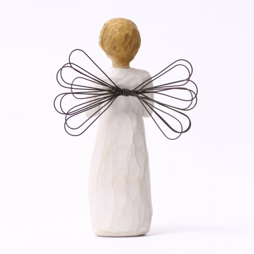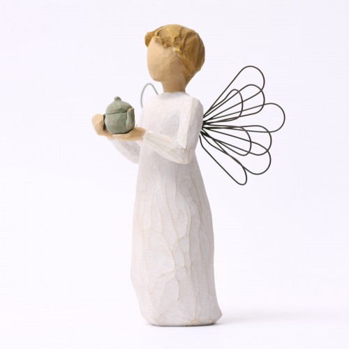 そして実際に手にした感じ。これもクセになってしまうポイントでして、意外とずっしりと重く高品質感があり、表面をなでると彫刻の面が感じられて、なんだかすべすべしていて、ああ彫刻っていいなと、そんな風に感じて頂けるんじゃないかと思います。ウィローツリーのデザインコンセプトは「アンティーク」で、敢えて色褪せたようにペイントされ、天使の羽根には錆び加工がされています。1つ1つペイントされているので、時期によって少しづつ色合いが異なりますので、そういったところも楽しんで頂ければと思っています。